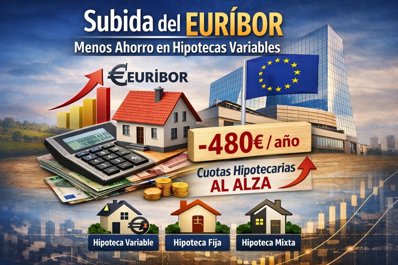 El Euríbor encadena su tercera subida y reduce el ahorro en las hipotecas variables hasta 480 euros al año El